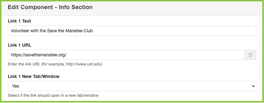 The Info Section Component creates organized sections, typically including links related to a particular topic. Each Info Section allows for a Title and Text and an optional Link (including Link Text and a URL).
