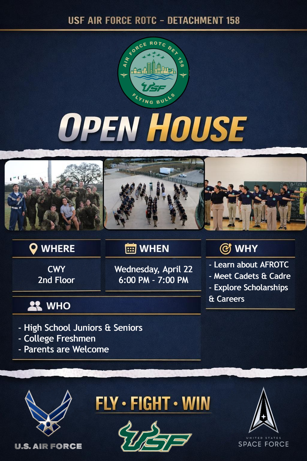 Then consider attending our next Open House Event! We will discuss information about AFROTC, its requirements, its expectations, and its benefits. Get the chance to ask questions and speak with the recruiting officer and current cadets about their experiences!